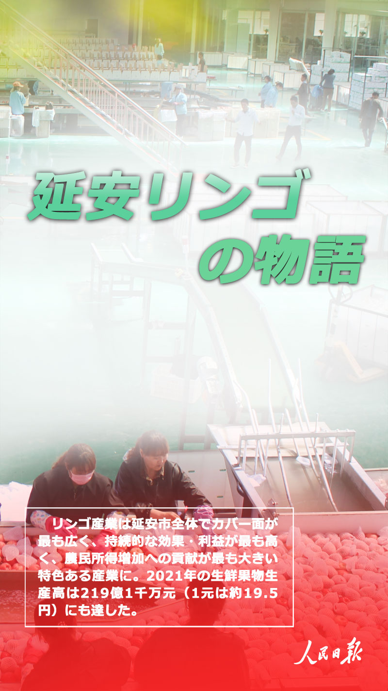 リンゴ産業(yè)は延安市全體でカバー面が最も広く、持続的な効果?利益が最も高く、農(nóng)民所得増加への貢獻が最も大きい特色ある産業(yè)に。2021年の生鮮果物生産高は219億1千萬元(1元は約19.5円)にも達した。