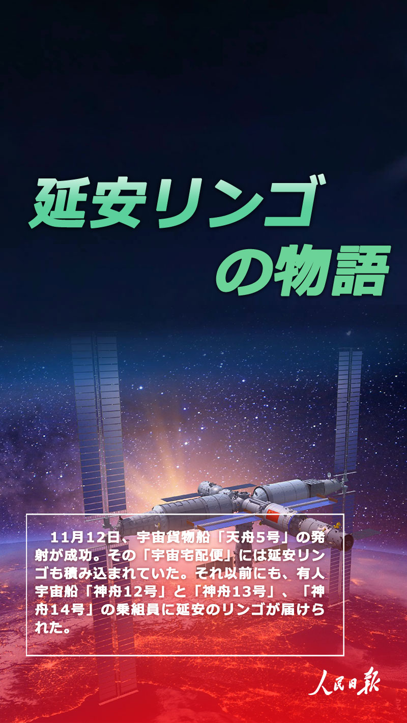 11月12日、宇宙貨物船「天舟5號」の発射が成功。その「宇宙宅配便」には延安リンゴも積み込まれていた。それ以前にも、有人宇宙船「神舟12號」と「神舟13號」、「神舟14號」の乗組員に延安のリンゴが屆けられた。