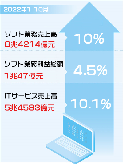 中國工業(yè)?情報(bào)化部(?。─?4日に明らかにしたところによると、今年1-10月の中國のソフトウェア?情報(bào)技術(shù)(IT)サービス業(yè)の運(yùn)営狀況は安定して好転し、ソフトウエア業(yè)務(wù)売上高は前年同期比10%増の8兆4214億元(1元は約19.4円)に上り、伸び率は第1-3四半期(1-9月)を0.2ポイント(p)上回った。