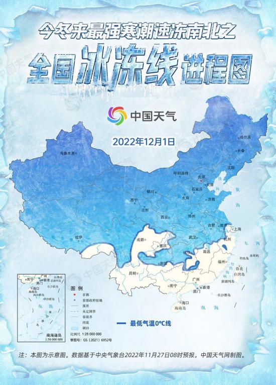 今シーズンの冬で最も強(qiáng)い寒気が中國に襲來しているのを背景に、今月27日から12月1日にかけて、中?東部の大部分の気溫が急降下しそうだ。局地的には20度以上下がり、「気溫0度ライン」が長江中?下流の一帯にまで南下するとみられている。寒波の影響で20省?區(qū)?市では一気に氷點(diǎn)下へと突入する。中國天気網(wǎng)が発表している中國全土の「気溫0度ライン」の南下進(jìn)捗度を示す地図を見て、自分の住んでいる所がいつ「氷點(diǎn)下」に突入するか確認(rèn)しておこう。中國天気網(wǎng)が報(bào)じた。