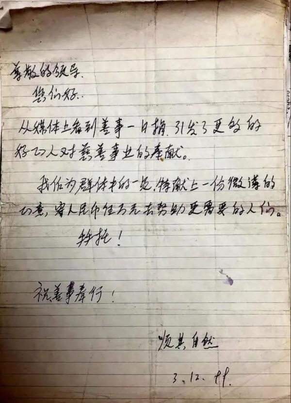 「順其自然」が初めて寄付した時(shí)の手紙(寫真提供?寧波市慈善総會(huì))。