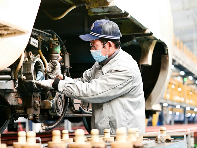 哈爾浜を走る高速列車のメンテナンスをする作業(yè)員(撮影?原勇)。