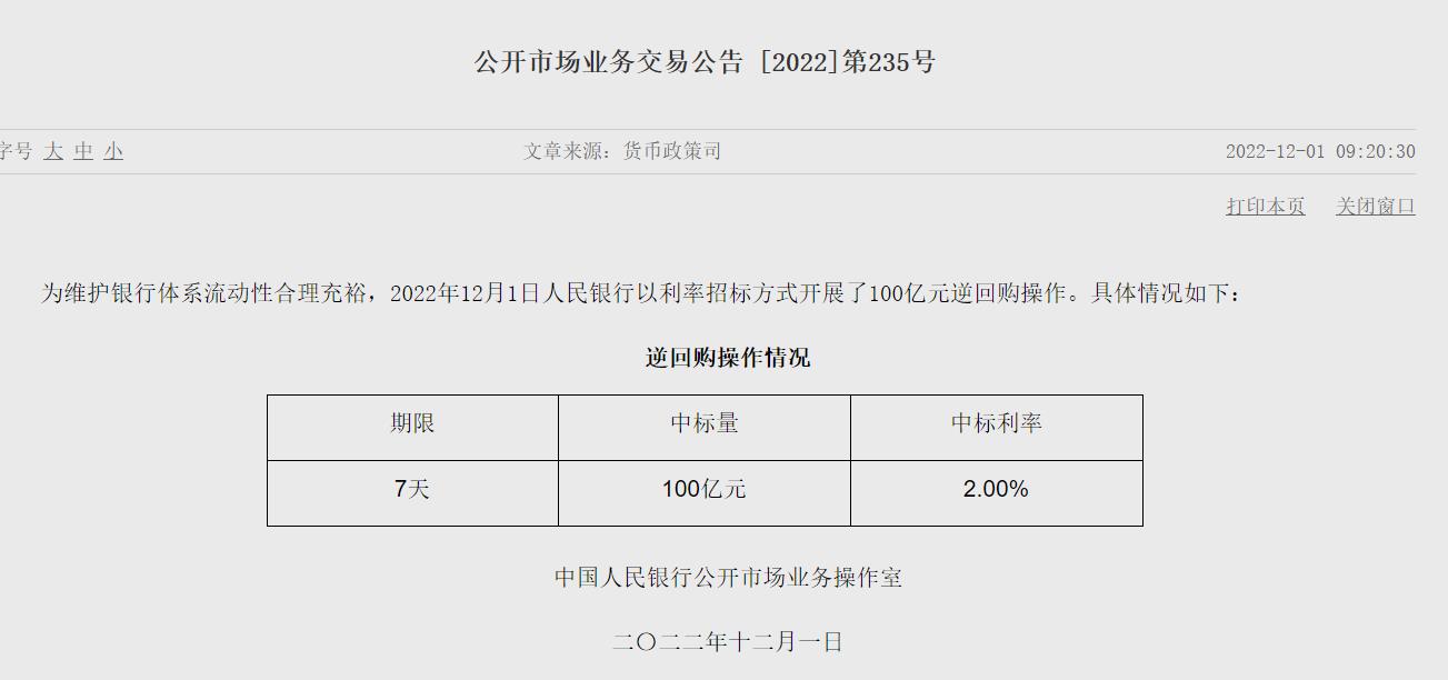 中國人民銀行(中央銀行)は公式サイトを通じて、銀行システムの流動性の合理的なゆとりを維持するために、2022年12月1日に金利入札方式によって100億元(1元は約19.2円)のリバースレポを実施したことを発表した。期間は7日間、金利は2.00%で據え置いた。