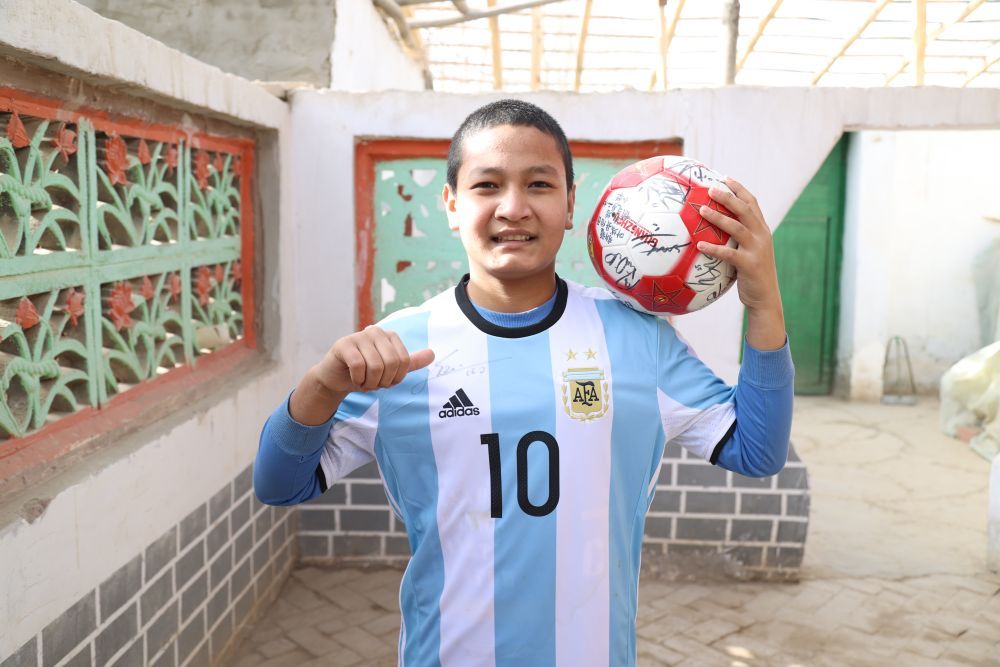 メッシ選手にプレゼントしてもらったボールを持ち、ユニフォームを著て寫る阿布都哈力克?艾木都君。畫像は喀什黨地區(qū)委員會(huì)宣伝部が提供