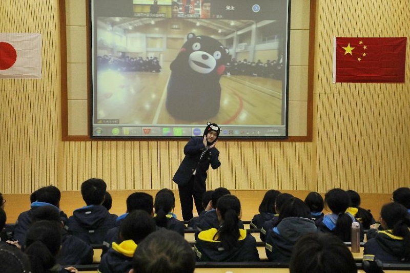 その他、北海市外國語実験學(xué)校の生徒は、「五十音図歌&拍手歌」を自信にあふれたなめらかな歌聲で歌い、若々しい力を披露したほか、年末にふさわしい絵本劇「明けましておめでとう」を通して、中國の舊正月(春節(jié))の風(fēng)習(xí)や伝統(tǒng)文化を生き生きと紹介した。また、八代中學(xué)校には 「くまモン」チームも同校に駆けつけて交流に參加した。明るくかわいい「くまモン」の登場に、生徒たちから大歓聲が上がっていた。