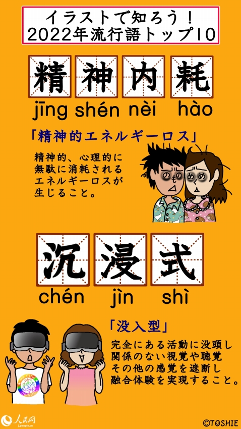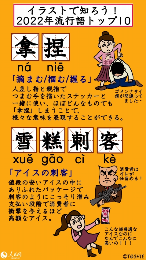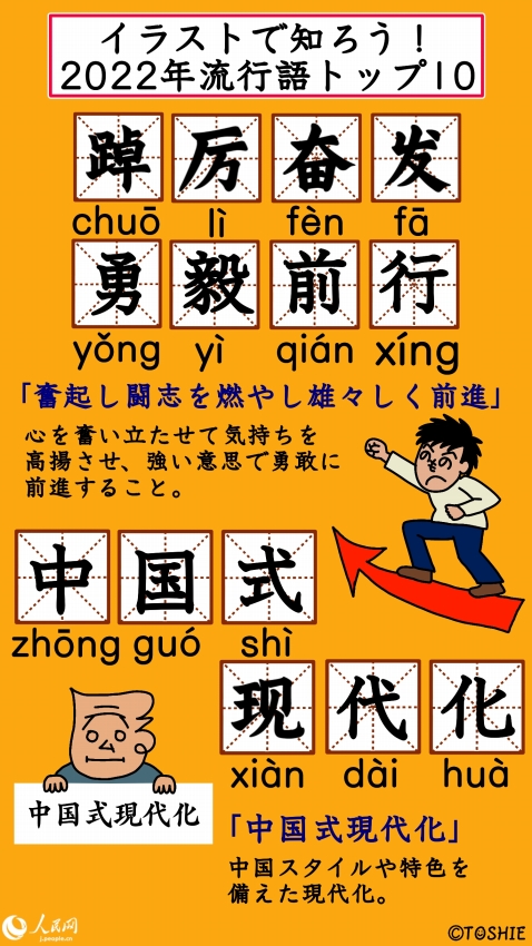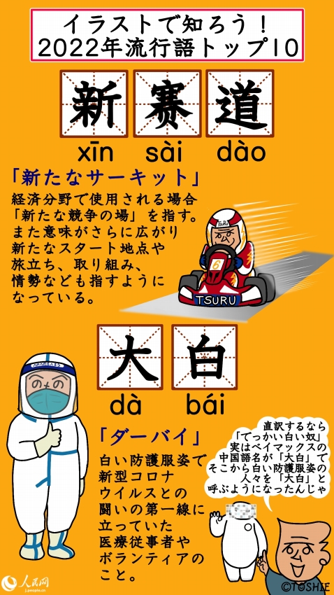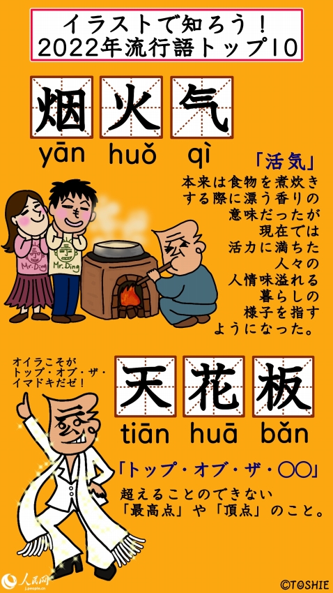 読者からの応募、ネットユーザーによる投票、専門家とメディアによる選出を経て、中國の語言文學(xué)雑誌「咬文嚼字」編集部はこのほど、「2022年流行語トップ10」を発表した。今年は、「踔厲奮発、勇毅前行(奮起し闘志を燃やし、雄々しく前進(jìn))」、「中國式現(xiàn)代化」、「新賽道(新たなサーキット)」、「大白(ダーバイ)」、「煙火気(活気)」、「天花板(トップ?オブ?ザ?○○)」、「拿捏(摘まむ/摑む/握る)」、「雪糕刺客(アイスの刺客)」、「精神內(nèi)耗(精神的エネルギーロス)」、「沈浸式(沒入型)」が選ばれた。