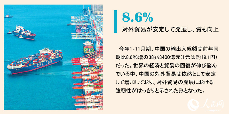 中國では2022年、食糧生産量が8年連続で6億5千萬トンの大臺に乗り、都市部の新規(guī)雇用者數(shù)の目標(biāo)を1ヶ月前倒しで達(dá)成し、1-11月期の輸出入総額は前年同期比8.6%増の38兆3400億元(1元は約19.1円)に達(dá)し、5G基地局が全ての市?県の市街地をカバーするようになった。今年達(dá)成した輝かしい10の數(shù)字は、中國経済の強(qiáng)靭性、大きなポテンシャル、みなぎる活力を示しており、人々の獲得感と幸福感、安心感をさらに高めている。