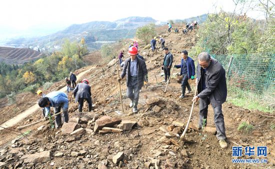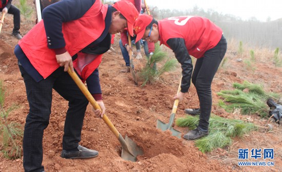 十堰市竹山県の荒山で植樹を行う男性たち。