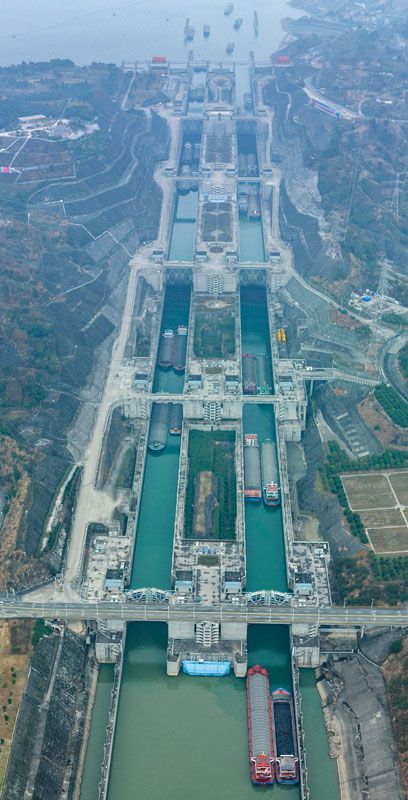 1月2日、湖北省宜昌市の三峽ターミナル五級(jí)閘門(mén)を秩序に基づいて通過(guò)する船舶(ドローンで撮影)。