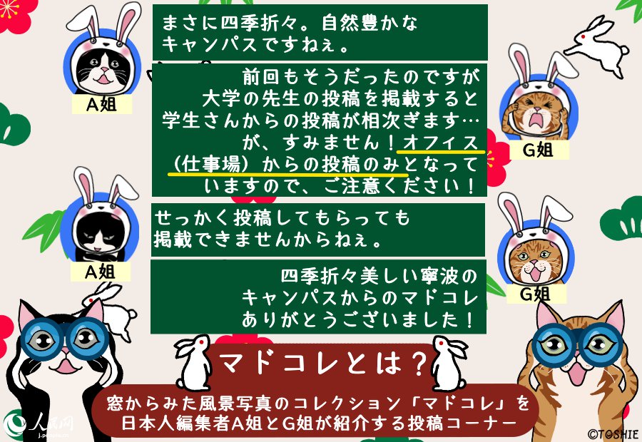人民網(wǎng)では、ウチのオフィスの窓からはこんな風(fēng)景またはこんなモノが見(jiàn)えるという自慢をしていただく「マドコレ(窓から見(jiàn)た風(fēng)景コレクション)」を毎週火曜日に掲載中!オフィスの窓からの眺めでもよし、お仕事中の窓からの眺めでもよし、とにかく窓から眺めた様子を?qū)懁筏繉?xiě)真とそれにまつわるエピソードをご投稿ください!