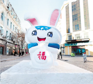 今年の中央大街の雪だるまは、干支のウサギと雪の結(jié)晶をテーマに、ブルーやピンクというオシャレな色使いで作られており、寫真映えするスポットとなっている。