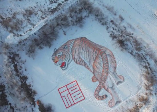 黒竜江省牡丹江市の農(nóng)民?呉桐軍さん(52)は最近、凍って雪が積もった自宅の3000平方メートルの池をキャンバスとして、大きなウサギと「?!工巫证蛎瑜訾?、ネット上で話題となっている。
