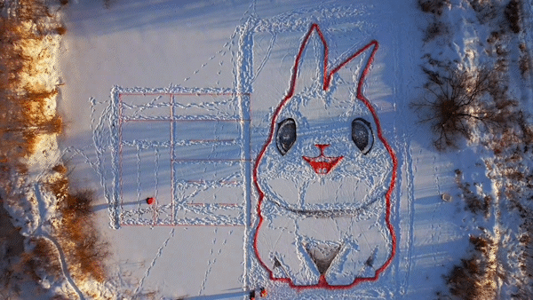 3000平方メートルのキャンバスは、バスケットボールコート7個(gè)分に相當(dāng)し、サイズを把握するために、呉さんはまず原稿用紙に下書きをして、ウサギの耳や目、鼻、そのほかの部分の比率を計(jì)算したうえで、雪の上にウサギと福の字を描き出した。その後、ドローンを使って動(dòng)畫を撮影しながら約40回の修正を繰り返し、3日間をかけて最終的な仕上げまで行った。雪のキャンバスには、かわいくて迫力あるウサギと福の字が見事に描き出されている。