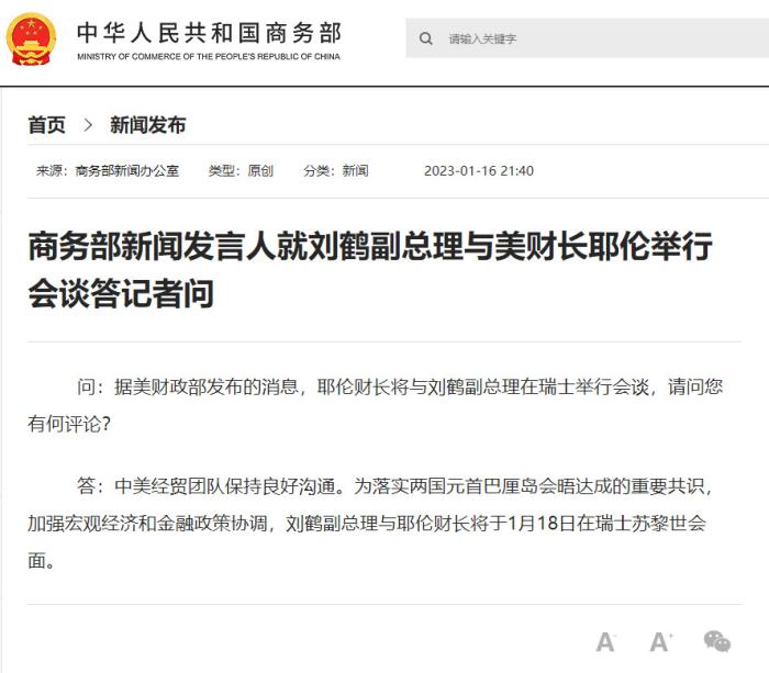 商務(wù)部、劉鶴副総理が米イエレン財務(wù)長官との會談について