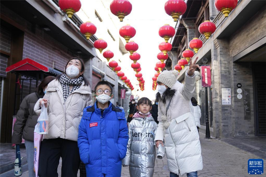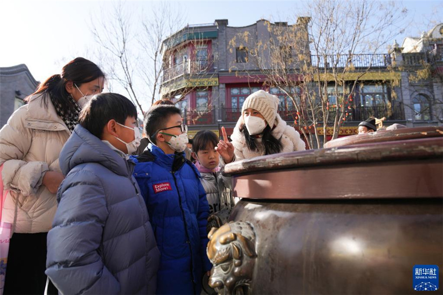 1月28日、北京市東城區(qū)鮮魚口街でツアー客に解説するガイドの何靜さん(寫真一番右、撮影?鞠煥宗)。