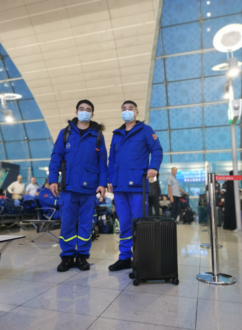 トルコのイスタンブール空港に到著した揚州市藍天救援隊の張昀路隊長と戴小冬隊員(寫真提供?張昀路)。
