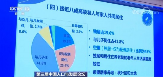 調(diào)査は100歳近い高齢者を中心にサンプリング手法で実施。80歳以上の高齢者が回答者の71.2%を占めた?;卮鹫撙韦Δ?、「高齢者施設(shè)に住んでいる」人が2.9%、「一人暮らし」が19.6%、「息子と同居」が41.8%を占めた?!敢蝗四氦椁贰工取概渑颊撙?人暮らし」の割合は合わせて45%だった。高齢者の8割の日常生活の世話は、家族が行っていた。うち、半分は息子と息子の妻だった。社會サービスや高齢者施設(shè)が占める割合は5.32%、家政婦は5.44%だった。80歳以下を見ると、世話をしているのは主に配偶者で、80歳を過ぎると、子供や孫の割合が急上昇するのに対して、配偶者の割合が急減している。