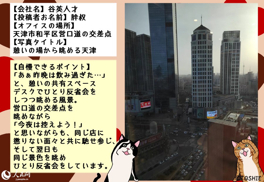 人民網(wǎng)では、ウチのオフィスの窓からはこんな風(fēng)景またはこんなモノが見(jiàn)えるという自慢をしていただく「マドコレ(窓から見(jiàn)た風(fēng)景コレクション)」を毎週火曜日に掲載中!オフィスの窓からの眺めでもよし、お仕事中の窓からの眺めでもよし、とにかく窓から眺めた様子を?qū)懁筏繉?xiě)真とそれにまつわるエピソードをご投稿ください!