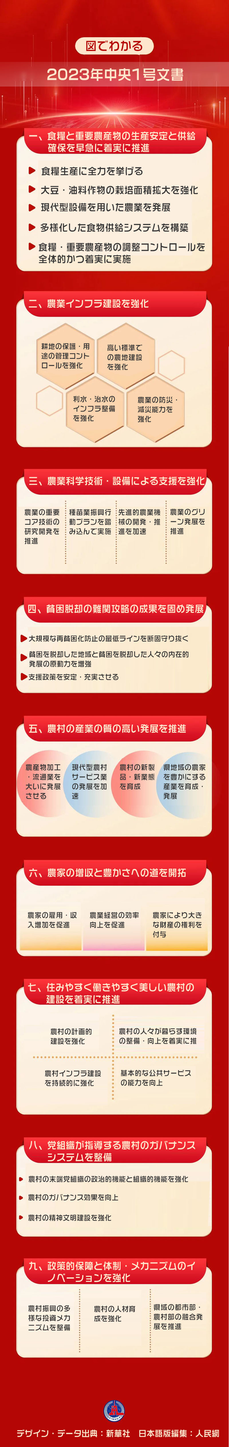 「2023年の農(nóng)村振興の全面的推進(jìn)における重點(diǎn)的取り組みの達(dá)成に関する中共中央と國(guó)務(wù)院の意見(jiàn)」と題された今年の「中央1號(hào)文書(shū)」の全文は計(jì)9つの部分に分かれる。具體的には、(1)食糧と重要農(nóng)産物の生産安定と供給確保を早急かつ著実に推進(jìn)(2)農(nóng)業(yè)インフラ建設(shè)を強(qiáng)化(3)農(nóng)業(yè)科學(xué)技術(shù)?設(shè)備による支援を強(qiáng)化(4)貧困脫卻の難関攻略の成果を固め発展(5)農(nóng)村の産業(yè)の質(zhì)の高い発展を推進(jìn)(6)農(nóng)家の増収と豊かさへの道を開(kāi)拓(7)住みやすく働きやすく美しい農(nóng)村の建設(shè)を著実に推進(jìn)(8)黨組織が指導(dǎo)する農(nóng)村ガバナンスシステムを整備(9)政策的保障と體制?メカニズムのイノベーションを強(qiáng)化。