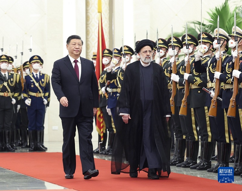 2月14日、習(xí)近平國(guó)家主席は國(guó)賓として中國(guó)を訪問(wèn)したイランのライシ大統(tǒng)領(lǐng)と北京の人民大會(huì)堂で會(huì)談した。寫(xiě)真は會(huì)談前に習(xí)主席が人民大會(huì)堂北大ホールで催したライシ大統(tǒng)領(lǐng)の歓迎式典の様子(撮影?龐興雷)。