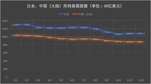 現(xiàn)在、日本と中國(大陸部)は米國債の上位2大債権國だ。最新のデータによれば、日本の12月の米國債保有殘高は前月末比60億ドル(1ドルは約133.9円)減の1兆763億ドル、中國の同保有殘高は前月比31億ドル減の8671億ドルだった。中國の保有殘高は5ヶ月連続で減少し、2010年6月以來の最低を更新した。また22年4月以降、中國の保有殘高は8ヶ月連続で1兆ドルを下回った。