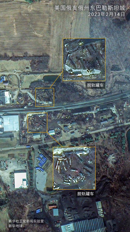 2月6日撮影の衛(wèi)星畫像は、現(xiàn)地の緊急対応當(dāng)局が事故車両上の有毒化學(xué)物質(zhì)を処理する様子を捉えている。厚く白い雲(yún)の上からでも、燃焼により生じた黒い煙が明らかに確認(rèn)できる。