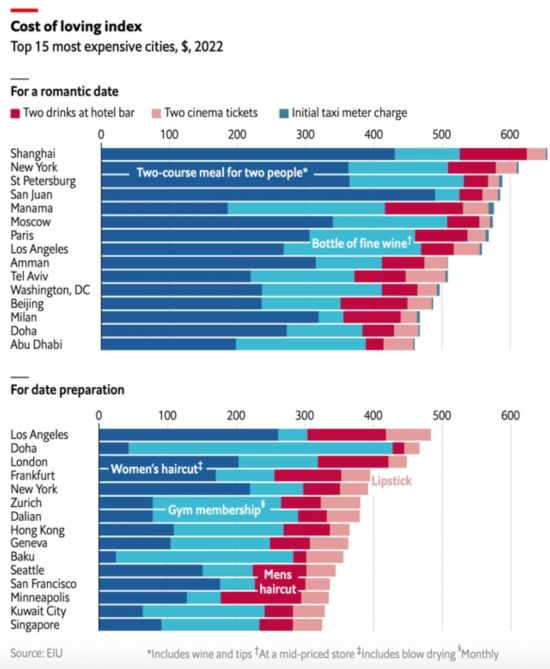 「バレンタインデーのコスト」は、エコノミスト?インテリジェンス?ユニット(EIU)の世界173都市における商品350種類の価格調(diào)査結(jié)果「世界生活費(fèi)用指數(shù)」に基づき、各指標(biāo)を?qū)Г訾筏皮い?。例えば、高?jí)ホテルで飲む酒(1杯)や2人分のディナー、映畫、タクシー、ワイン(1本)の価格などに基づき、「ロマンチックな夜」に関連する指標(biāo)を?qū)Г訾筏皮い?。(編集KN)