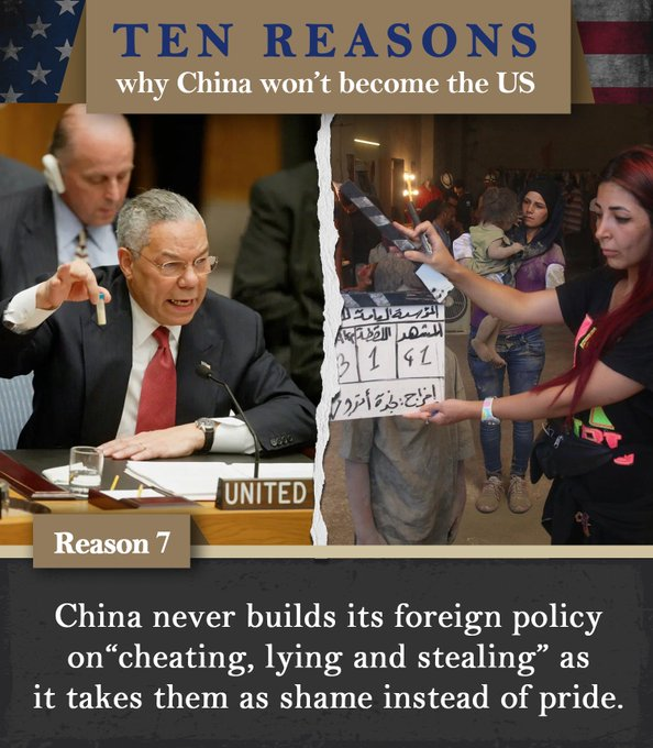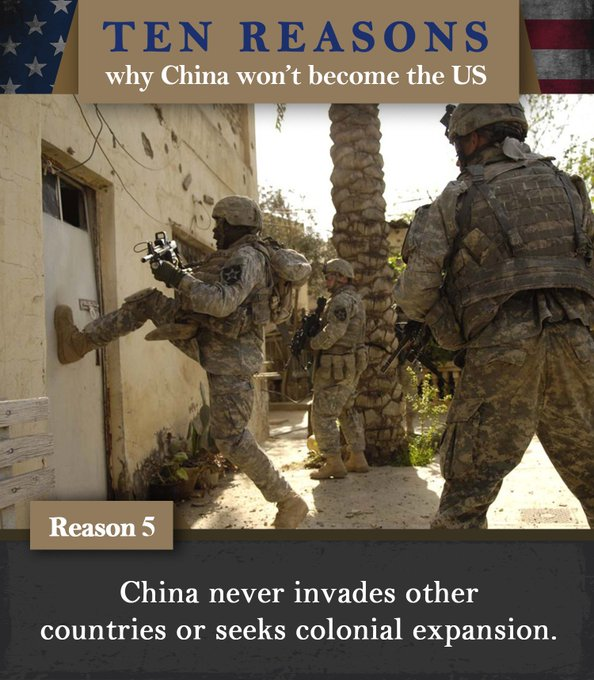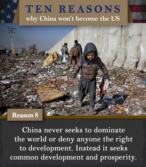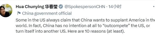 中國の華春瑩外交部長助理(外務(wù)次官補(bǔ))は21日夜、ツイッターに畫像を投稿して、「中國がもう1つの米國にならない10の理由」を示した。また「米國の一部には中國が世界で米國に取って代わろうとしているとの主張が常にあるが、実際には中國には米國を『超越する』意図は全くなく、自國をもう1つの米國に変える意図もない」と指摘した。