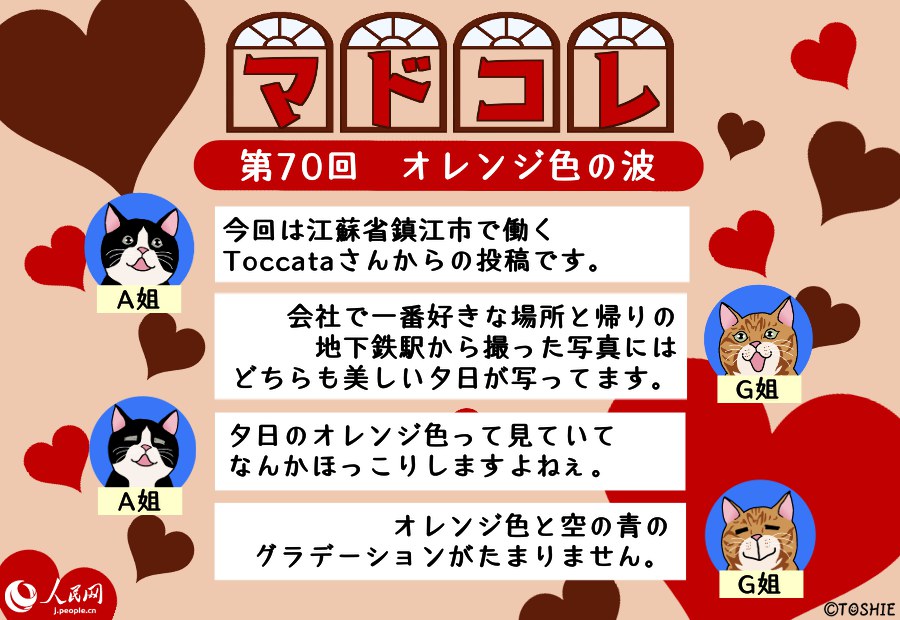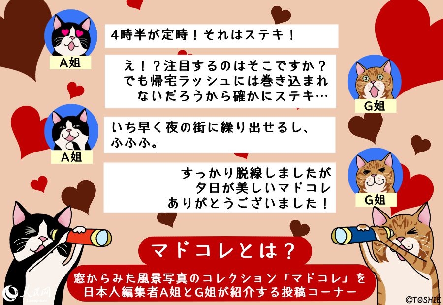 ウチのオフィスの窓からは、こんな風(fēng)景またはこんなモノが見えると自慢していただく「マドコレ(窓から見た風(fēng)景コレクション)」コーナー。どこまでも続く青い空や遠(yuǎn)くに見える山々といった自然の風(fēng)景から、オフィス街に建ち並ぶ高層ビルや幹線道路を走る車、庶民の暮らしが垣間見えるローカルな街並み、はたまた移動中の車窓からの眺めなどなど、高さや場所も異なれば、その窓から眺める風(fēng)景も千差萬別。中には仕事の意欲をアップさせてくれる元気の出る光景もあれば、疲れを癒してくれるほっこりした風(fēng)景も。そんな皆さまからお寄せいただいたマドコレの數(shù)々を、毎週火曜日に、人民網(wǎng)日本人編集者のA姐とG姐がコメントしながら、のんびり紹介していきます。