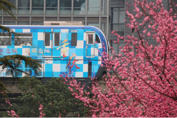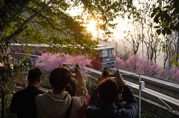 重慶レール交通2號(hào)線沿いでは、美人梅の花が競うように咲き誇り、その花の間を列車が走り抜けるシーンは、まるで童話の世界のようで、必見の撮影スポットとなっている。