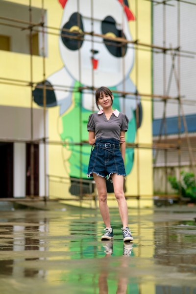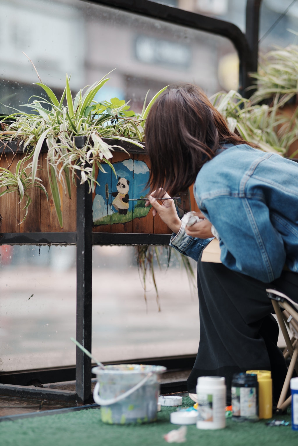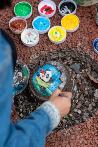 それからというもの姜さんは仕事の合間に、絵の具とパレットを持って出かけては、街の中でインスピレーションを探すようになった。ニュータウンから舊市街まで歩き回り、道端の石の車止めや街中の階段、廃棄木材など、どこにでもあるものにパンダを描き、街を飾っている。