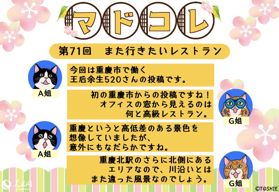 ウチのオフィスの窓からは、こんな風(fēng)景またはこんなモノが見えると自慢していただく「マドコレ(窓から見た風(fēng)景コレクション)」コーナー。どこまでも続く青い空や遠(yuǎn)くに見える山々といった自然の風(fēng)景から、オフィス街に建ち並ぶ高層ビルや幹線道路を走る車、庶民の暮らしが垣間見えるローカルな街並み、はたまた移動中の車窓からの眺めなどなど、高さや場所も異なれば、その窓から眺める風(fēng)景も千差萬別。中には仕事の意欲をアップさせてくれる元気の出る光景もあれば、疲れを癒してくれるほっこりした風(fēng)景も。そんな皆さまからお寄せいただいたマドコレの數(shù)々を、毎週火曜日に、人民網(wǎng)日本人編集者のA姐とG姐がコメントしながら、のんびり紹介していきます。