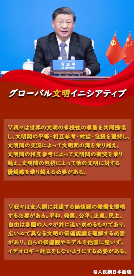 習(xí)総書(shū)記は「各國(guó)の前途?命運(yùn)が緊密に結(jié)び付き合っている今日、異なる文明の包摂と共存、交流と相互參考は、人類(lèi)社會(huì)の現(xiàn)代化のプロセスの推進(jìn)、世界の文明の多様性の推進(jìn)にとってかけがえのない役割を持つ」と指摘し、グローバル文明イニシアティブを打ち出した。