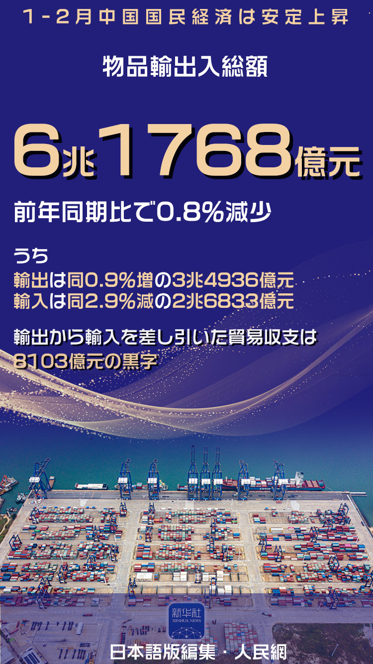 統(tǒng)計(jì)によれば、同期の物品輸出入総額は同0.8%減の6兆1768億元だった。そのうち輸出は同0.9%増の3兆4936億元、輸入は同2.9%減の2兆6833億元。輸出から輸入を差し引いた貿(mào)易収支は8103億元の黒字だった。