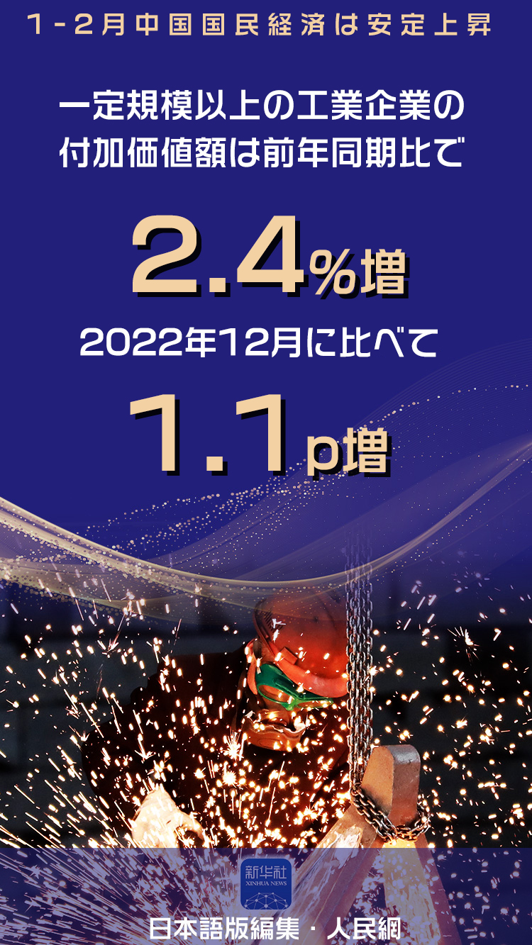 生産から見ると、工業(yè)とサービス業(yè)の生産がそろって加速した。同期の全國の一定規(guī)模以上の工業(yè)企業(yè)(年売上高2000萬元以上の企業(yè))の付加価値額は前年同期比で2.4%増加した。成長率は2022年12月を1.1ポイント(p)上回り、22年第4四半期(10-12月)以降の月ごとに低下する局面に終止符を打った。