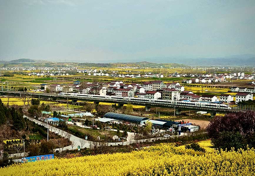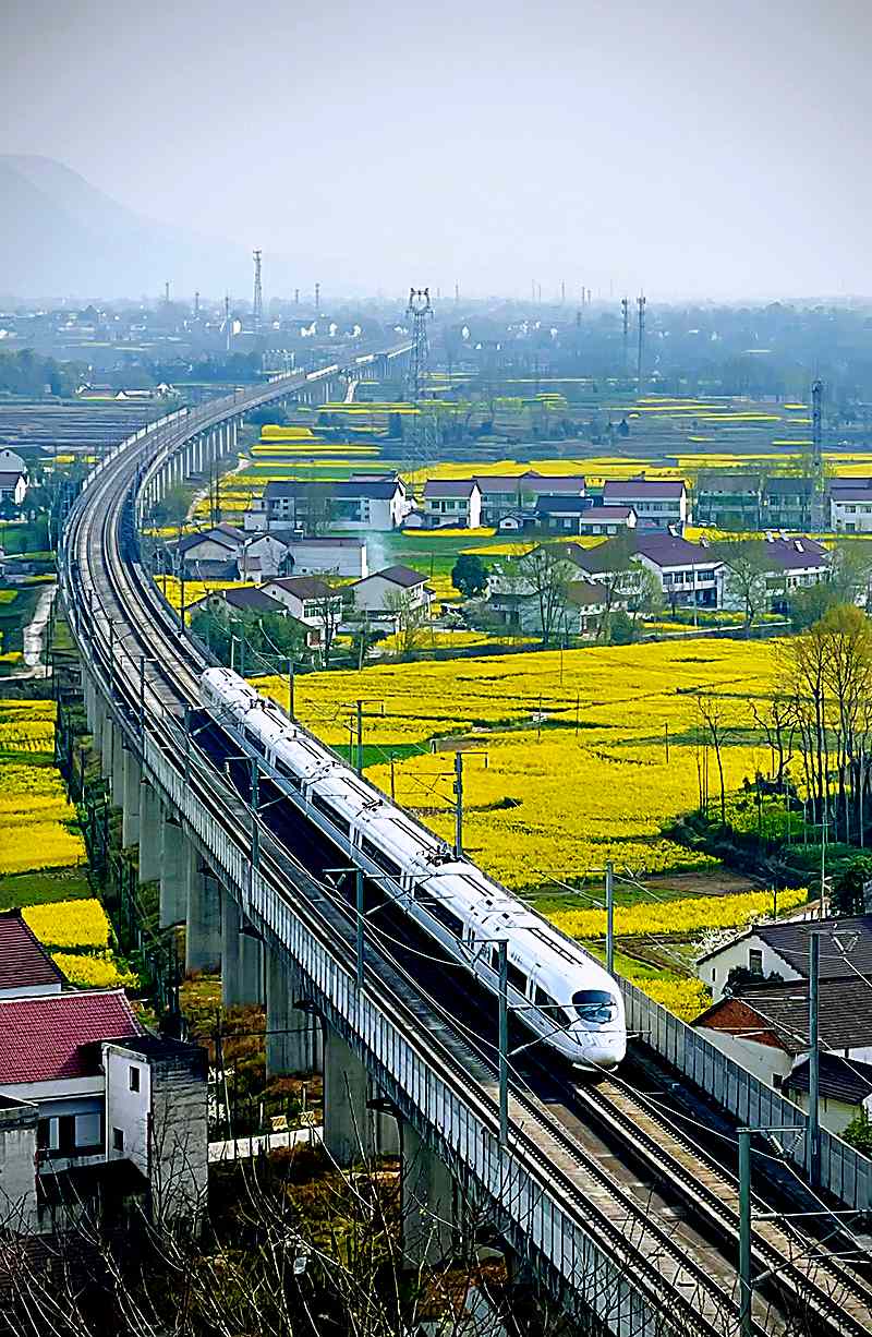 菜の花畑を走り抜ける高速列車(chē)(撮影?周博倫)。