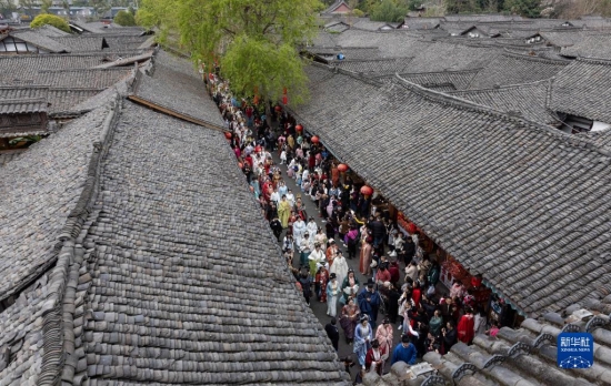 3月18日、イベントの開(kāi)幕式で漢服を著て古城の中を練り歩いた中國(guó)各地の伝統(tǒng)衣裝愛(ài)好者(撮影?江宏景)。