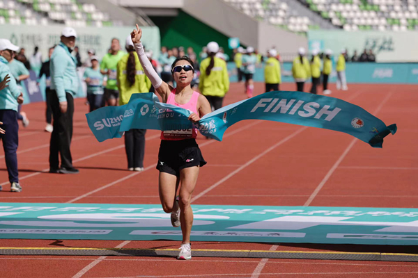 女子の部でトップとなり、蘇州オリンピックスポーツセンターでゴールテープをきった楊花さん(寫(xiě)真提供?大會(huì)組織委員會(huì))。