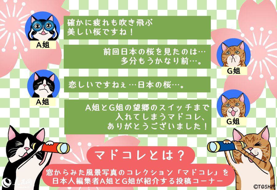 ウチのオフィスの窓からは、こんな風(fēng)景またはこんなモノが見えると自慢していただく「マドコレ(窓から見た風(fēng)景コレクション)」コーナー。どこまでも続く青い空や遠(yuǎn)くに見える山々といった自然の風(fēng)景から、オフィス街に建ち並ぶ高層ビルや幹線道路を走る車、庶民の暮らしが垣間見えるローカルな街並み、はたまた移動中の車窓からの眺めなどなど、高さや場所も異なれば、その窓から眺める風(fēng)景も千差萬別。中には仕事の意欲をアップさせてくれる元?dú)荬纬訾牍饩挨猡ⅳ欷?、疲れを癒してくれるほっこりした風(fēng)景も。そんな皆さまからお寄せいただいたマドコレの數(shù)々を、毎週火曜日に、人民網(wǎng)日本人編集者のA姐とG姐がコメントしながら、のんびり紹介していきます。