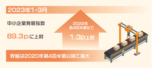 中國中小企業(yè)協(xié)會が9日に発表した最新のデータによると、今年第1四半期(1-3月)には中國の中小企業(yè)発展指數(shù)(SMEDI)が89.3ポイント(p)になり、昨年第4四半期(10-12月)に比べて1.3p上昇し、上昇幅は2020年第4四半期以降で最も大きかった。