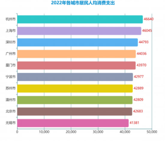 各地の統(tǒng)計局が公開しているデータによると、2022年、杭州市の1人當たりの消費は上海市(4萬6045元)や広東省深セン市(4萬4793元)、広東省広州市(4萬4036元)を上回ってトップだった。杭州市のほか、浙江省寧波市(4萬2977元)や浙江省溫州市(4萬2809元)も名前を連ねており、浙江省からは3都市がトップ10入りした。