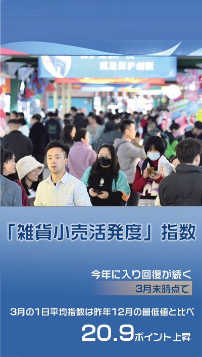 このほど、國家情報センターは「商業(yè)圏消費(fèi)活発度」「地下鉄旅客輸送活発度」「景勝地消費(fèi)活発度」「都市配送物流活発度」などの指數(shù)を発表した。これらは232の代表的な商業(yè)圏の人の流れの量、18都市における地下鉄の1日あたり旅客輸送量、2000余りの景勝地周辺の交通量、都市部の商品配送車両の運(yùn)行量に基づいている。これによると、3月末時點で「商業(yè)圏消費(fèi)活発度」と「雑貨小売活発度」の3月の1日平均指數(shù)はいずれも昨年12月の最低値と比べ大幅に回復(fù)した。今年第1四半期(1-3月)、「地下鉄旅客輸送活発度」と「生活サービス業(yè)消費(fèi)活気指數(shù)」も前期比で大幅に上昇した。國家情報センタービッグデータ発展部の専門家は、これらの統(tǒng)計について、消費(fèi)が回復(fù)?好転基調(diào)を示し、経済の活力が日増しに強(qiáng)まっていることを示していると指摘する。