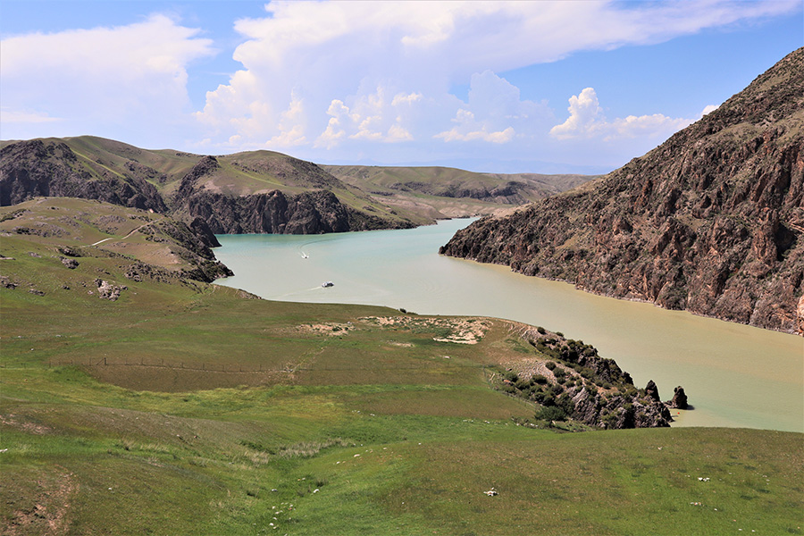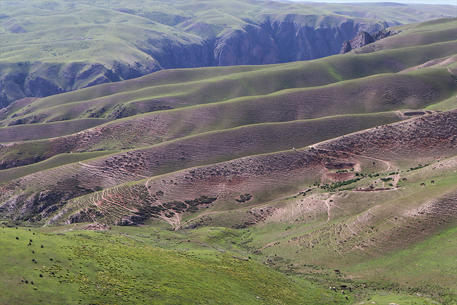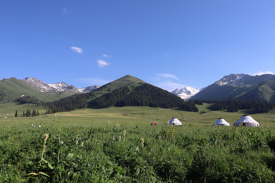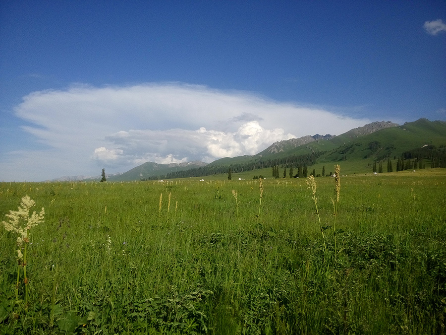 新疆の西北、伊犁州に伊犁(イリ)河が流れて美しい渓谷美をつくって、その流域は伊犁河谷と呼ばれています。春には杏子の花が咲き、初夏にはラベンダーの紫花が咲き誇り、薫衣草の郷と言われます。伊犁河谷は天馬の里で、春に杏子の花でピンク色に染まる草原で草を食む馬は、真に天馬で訪れる人を夢幻の世界に誘います。そんな伊犁河谷にある“喀拉峻”(カラジュン)は緑の大地が海のように波打つ草原でした。 緑の波の上を柔らかく頬をなで吹き渡る風(fēng)、雪山を背に草原には黃、紫、赤の五花が咲き、まるで夢の空中庭園を浮遊している不思議な感覚になります。そして濶克蘇(コクソ)は中天山山脈から流れ出た水が谷を刻みつくられた雄大な峽谷で、喀拉峻の大地に深い谷を刻んでいます。夏には天山の雪が解け炭酸カルシュウムを含む地層を削り濶克蘇河の水は乳白色に変わります。