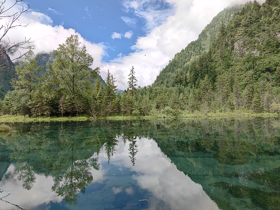 歩き始めてしばらく行くと、透き通った湖面に木々の緑が映る美しい湖に出ました。黃緑色の草が湖面に反射して見(jiàn)事な美しさです。九寨溝ともそれほど距離も離れていないので美しさも九寨溝にも似ているのでしょうか。