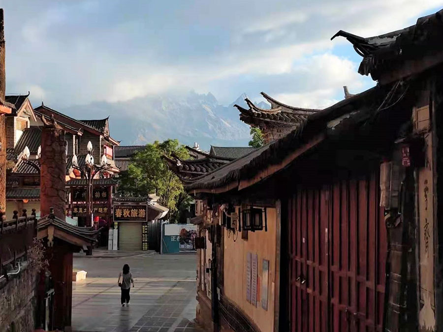 朝早く古鎮(zhèn)を散歩しました??諝荬韦?、建物の向こうに朝日に照らされた玉龍雪山が聳えていました。