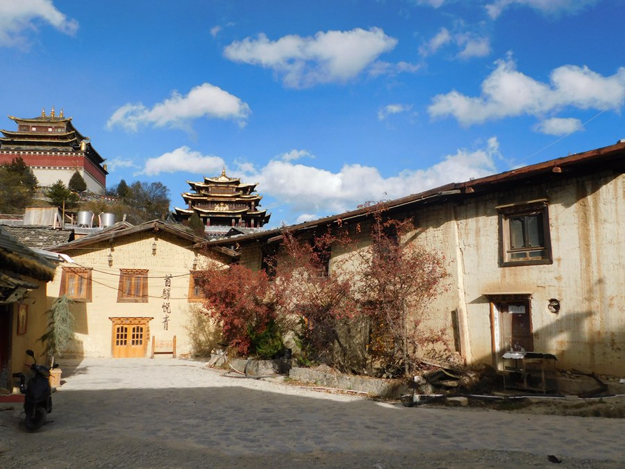 民宿で泊り、夜中に目覚めるとベッドの真上のガラスの天井窓いっぱいに星が輝き、流れ星が天窓を橫切りました。夢(mèng)の続きを見ているような體験でした。シャングリラの街を見下ろす丘の上に登りました。不思議な存在感を與える廃寺があり、梅里雪山を遠(yuǎn)くに望むことができました。