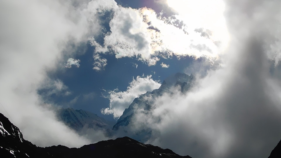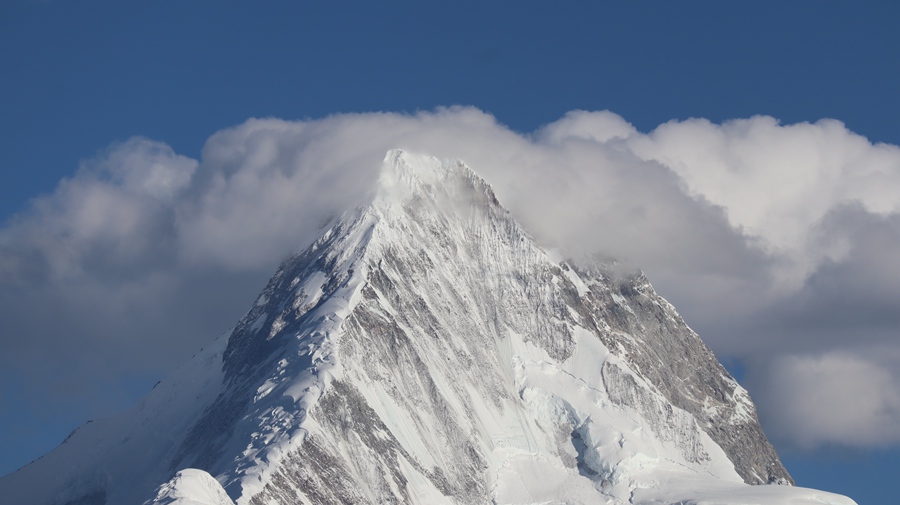 2018年10月、四川省第一の高峰、海抜7,556mの貢嘎(ゴンガ)の麓の氷河、海螺(ハイロウ)溝に行きました。周囲の雪峰は厚い雲(yún)に覆われ貢嘎は見えませんでした。しかし氷河を歩きながら後ろをふりかえると、ポツンと點のように青い色が現(xiàn)れました。青い點は次第に大きくなり、額縁の絵を見るかのように貢嘎の峰々が現(xiàn)れました。壯大な大自然のドラマの一コマでした。氷河を歩き、上を見ると渓谷をまたいで、すごい高度をロープウェイが通り、それは點のように小さく見えました。その時、ロープウェイに乗っていた人は、突然現(xiàn)れた貢嘎の峰を見てきっと大きな歓聲を上げたことでしょう。