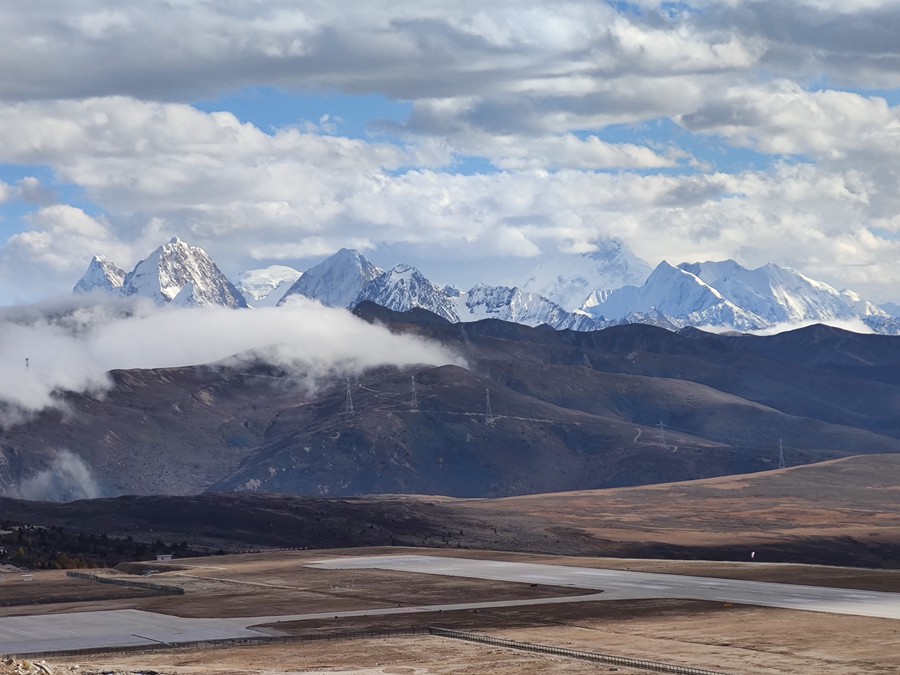 そんな貢嘎を再び見たいと思い2022年10月、貢嘎のビューポイントの一つ、冷嘎措(ロンガソ)に行きました。冷嘎措は海抜4500mにある小さな湖です。貢嘎が湖面に映ることで知られています。湖面の向こうに聳える貢嘎の崇高さに心をうたれ、夕日に映える貢嘎を見て暗くなった山道を降りました。成都から國道318號を行くと康定という街があります。そこに中國で三番目の海抜4,238mにある康定空港があります。康定空港の滑走路からも貢嘎の山々を見ることができます。