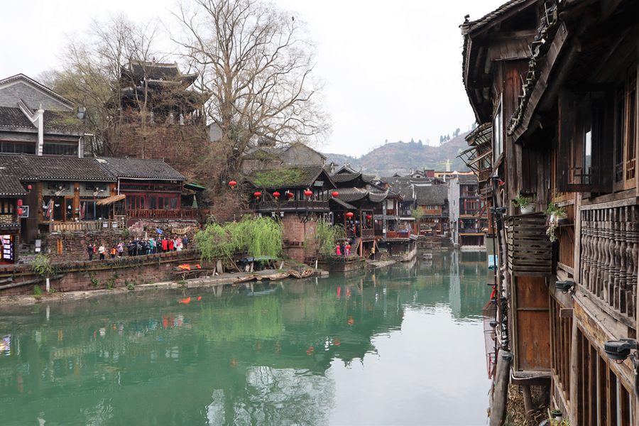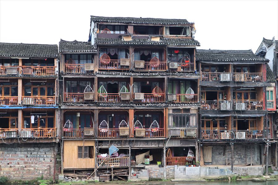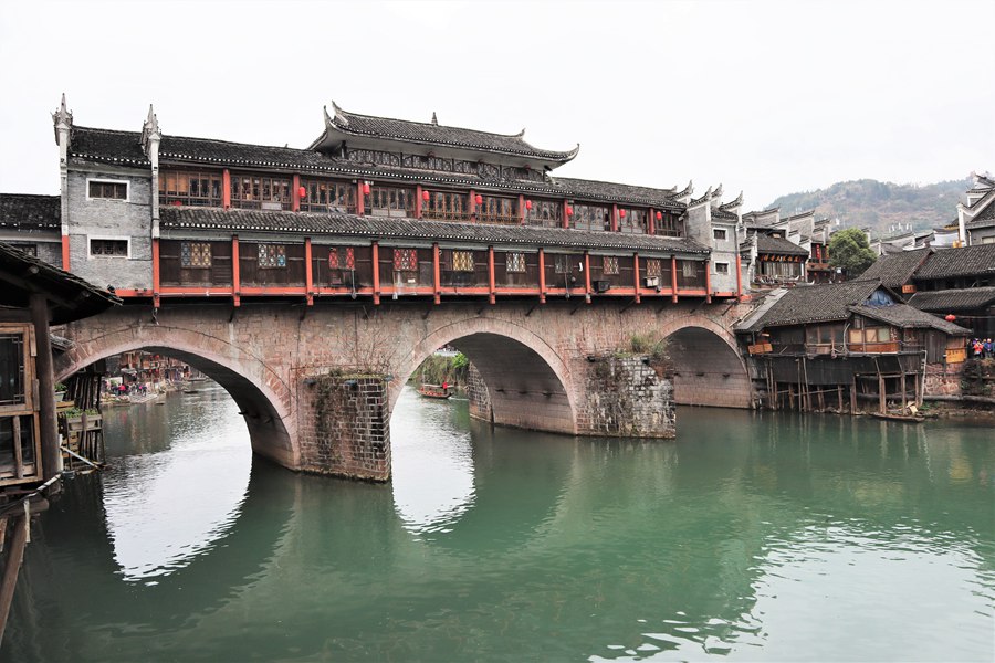 著名な文豪や畫家を輩出し、人と古城文化が混然一體となった湘西民族の風情が殘る古城です。街の真ん中を長江の支流、沱江(トゥオジャン)が流れ、両岸を結(jié)ぶ飛び石と古代の趣ある虹橋は鳳凰を象徴する風景です。沱江の河岸には木造の古建築の建物が並び細い路地から沱江に面した古い建物に入ると地下への階段がついています。昔は地下から直接河に出て舟を利用していたのでしょうか。また木造建物と石を積み上げた石造りの建築が調(diào)和しているのもこの古城を歩く楽しさです。沱江には“沱江四橋”と呼ばれる趣のある「風橋」「雨橋」「雪橋」「霧橋」がかかっています。橋の上には木製で屋根のある趣のある回廊風の建物があり、その橋を渡り古の文化に浸るのも鳳凰の楽しみ方の一つです。