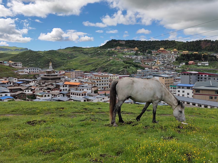 郎木寺は二つのチベット仏教寺院が白龍江をはさみ向かい合っています。丘の上に登ると白い馬が草を食みその向こうに寺院の建物が輝いていました。